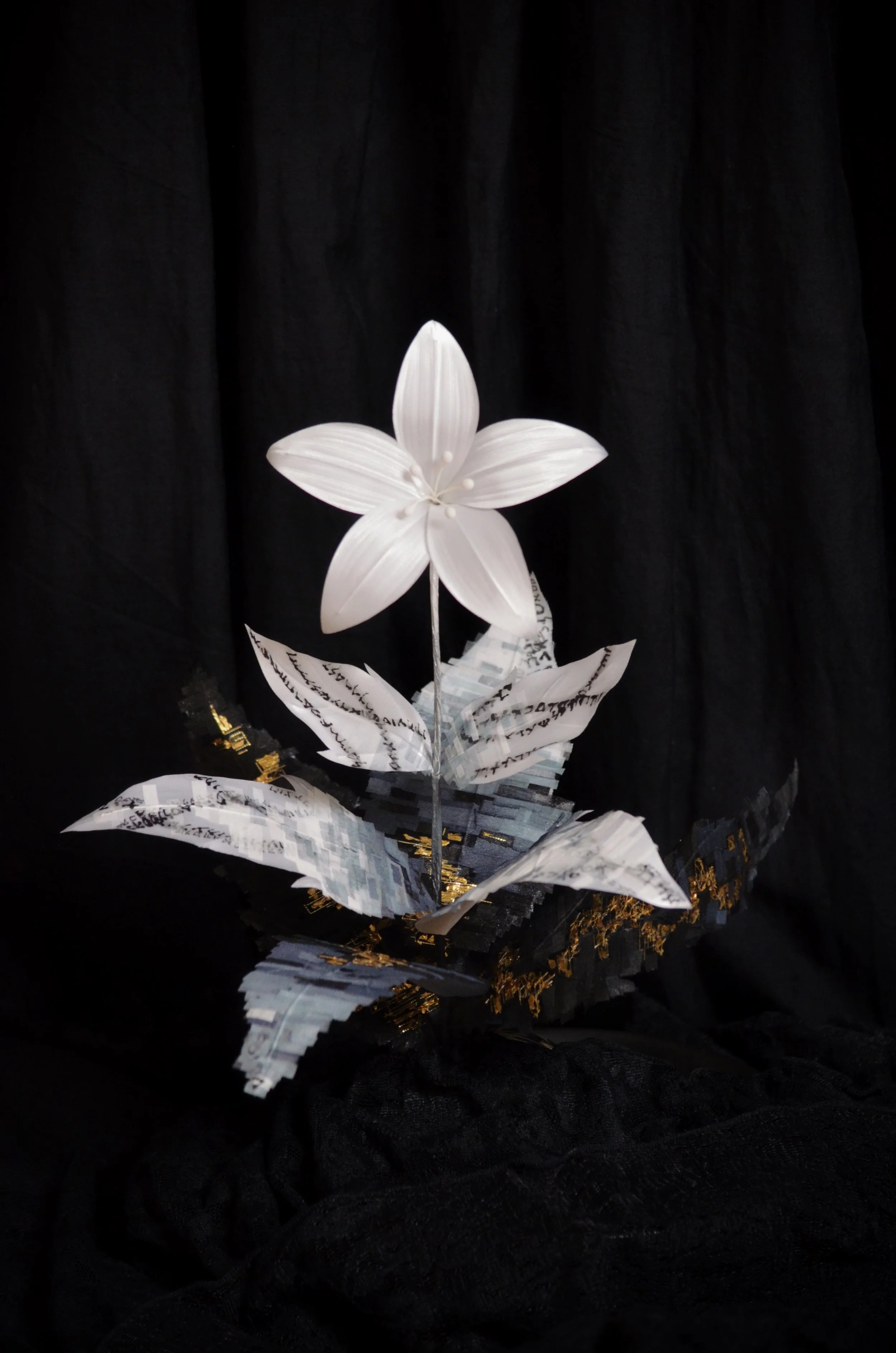 A soul divided, a body at war.Human and shade, male and female, tenderness and rage.Torn, and still she blooms.This piece depicts Kaine in three stages: her normal self, her form when overtaken by the Black Scrawl, and her final transformation into a Shade. The text on the leaves is actually Kaine’s own cursing tongue, written in the Black Scrawl script.